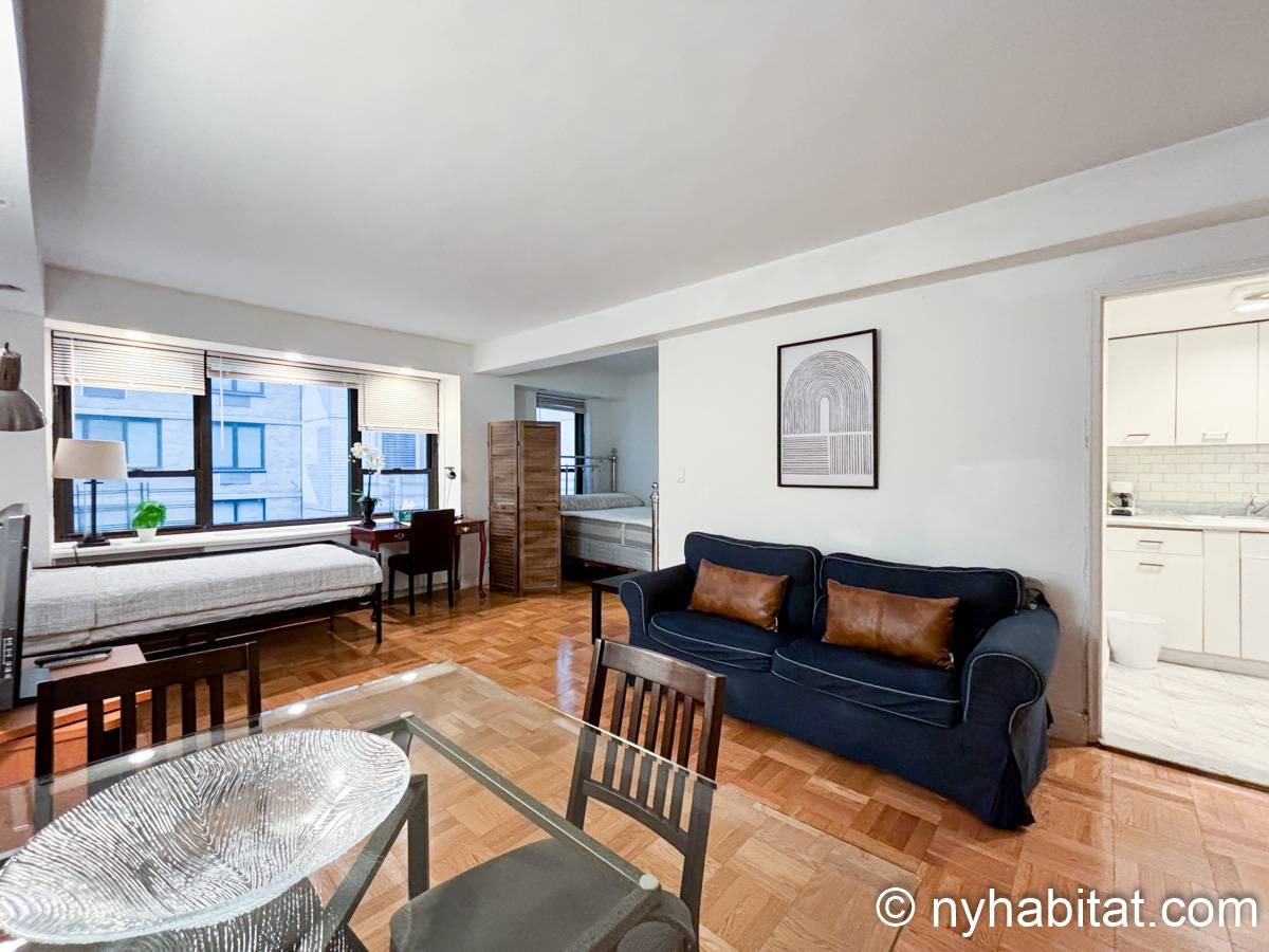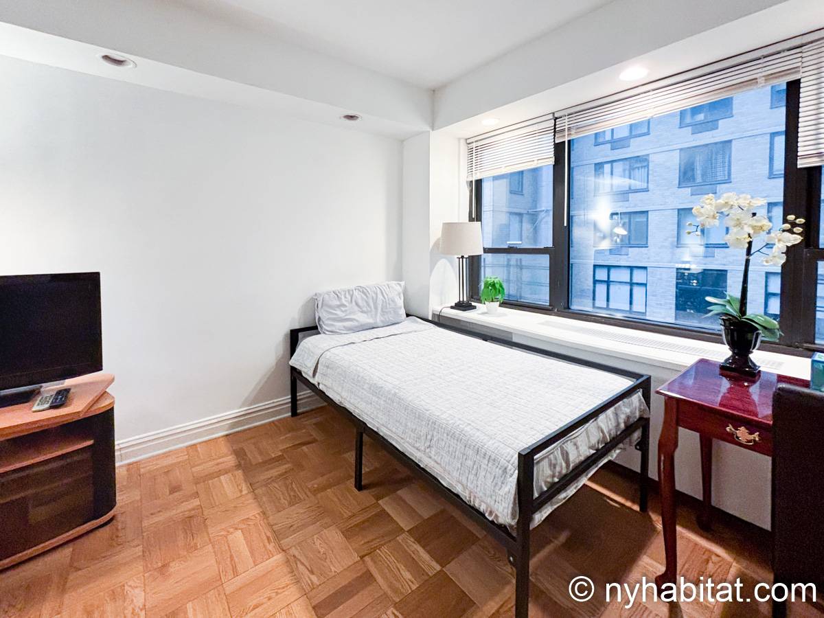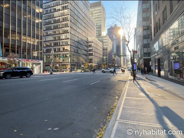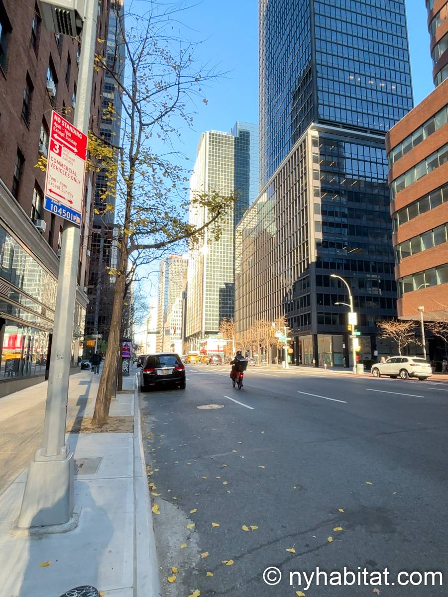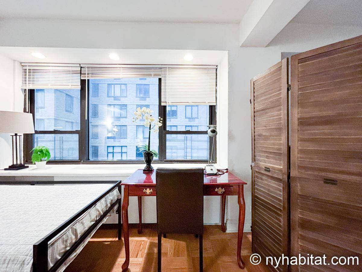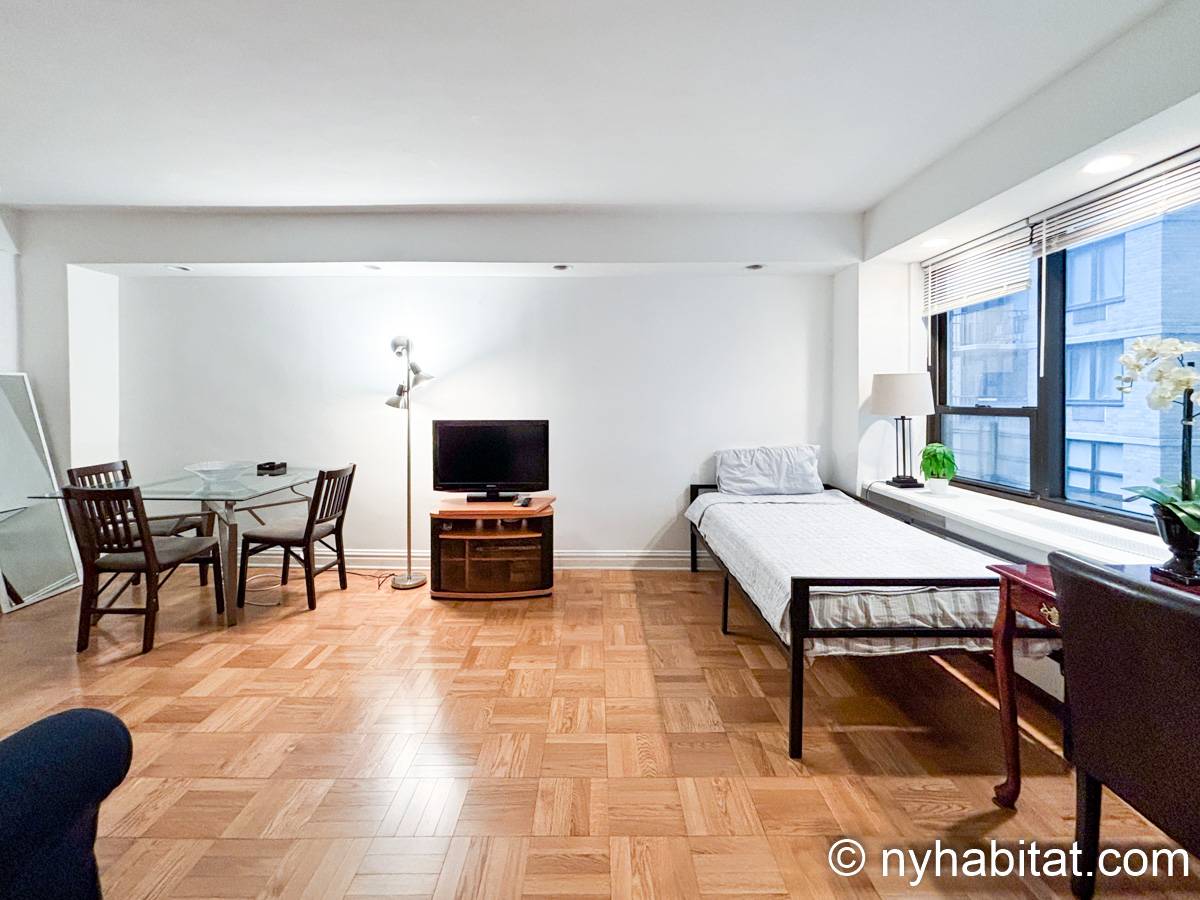 Este apartamento estudio amueblado con un baño está disponible en Midtown East, Manhattan. Se encuentra ubicado a 1,3 km al este del Times Square y a 800 metros de la estación Grand Central y del edificio Chrysler. Este apartamento se encuentra en el 7mo piso (que equivale al 6to piso en Europa) de un edificio de 13 pisos situado cerca de la 47th Street y la 3rd Avenue. Este edificio neoyorquino dispone de una lavandería y un portero.