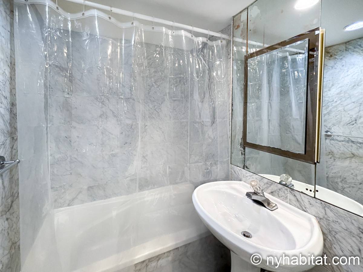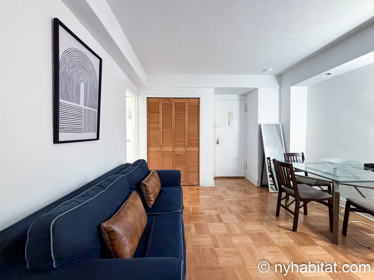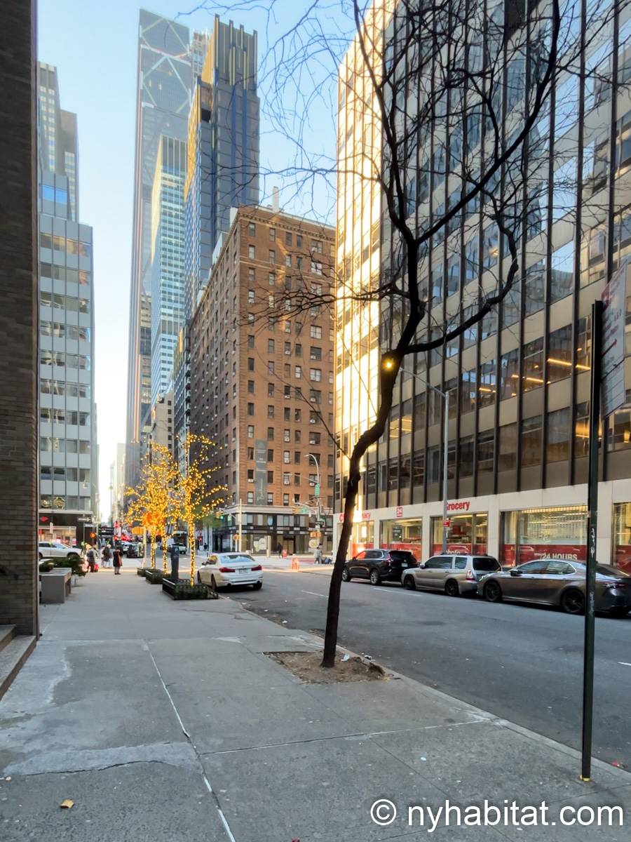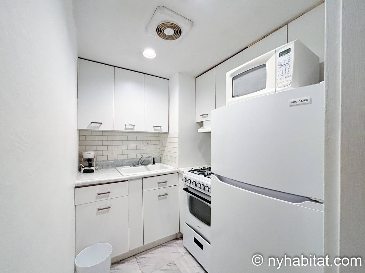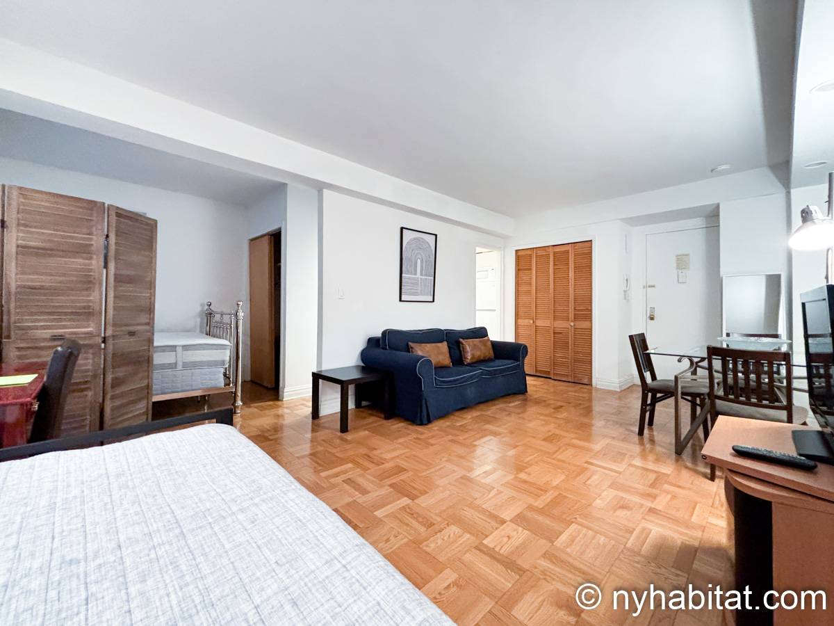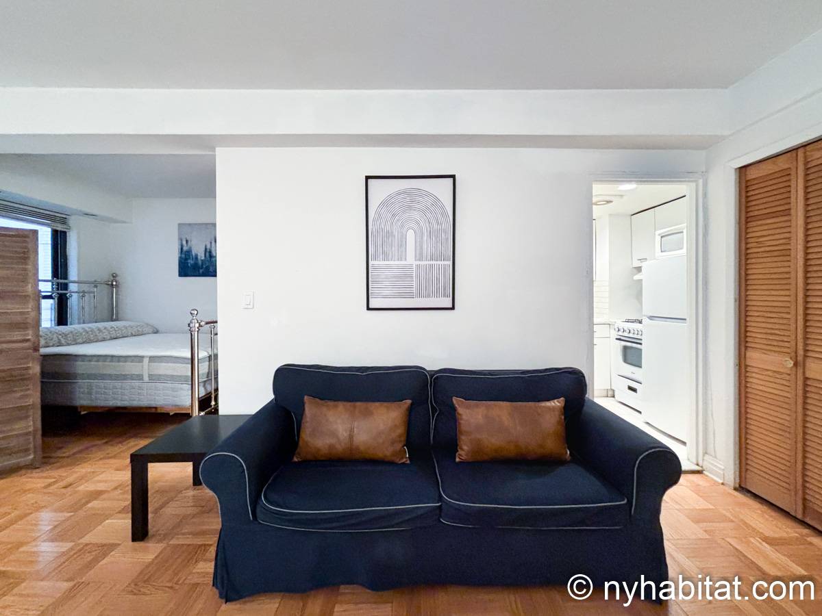 Este apartamento estudio amueblado con un baño está disponible en Midtown East, Manhattan. Se encuentra ubicado a 1,3 km al este del Times Square y a 800 metros de la estación Grand Central y del edificio Chrysler. Este apartamento se encuentra en el 7mo piso (que equivale al 6to piso en Europa) de un edificio de 13 pisos situado cerca de la 47th Street y la 3rd Avenue. Este edificio neoyorquino dispone de una lavandería y un portero.