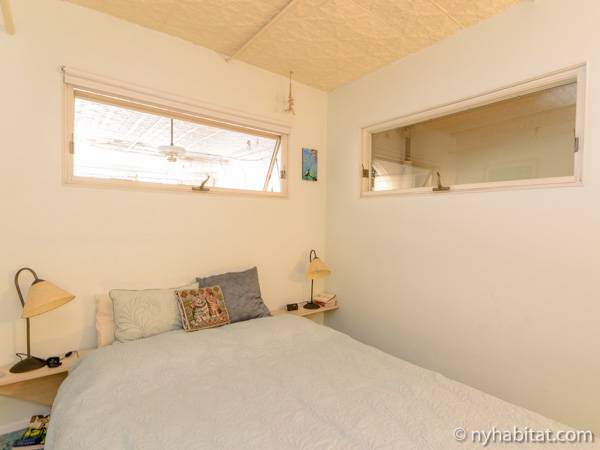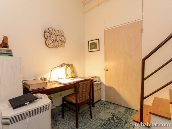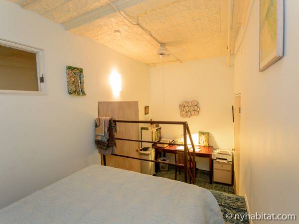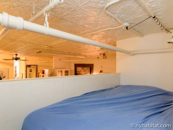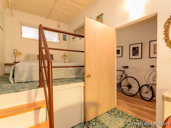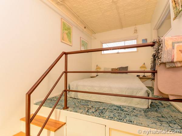 La segunda habitación disponible es el cuarto de la cama alta (tercera sala de estar en las fotografías y en la distribución de planta). Incluye un colchón tamaño queen en una cama alta elevada a nivel de tarima accesible a través de 4 escalones. También dispone de escritorio con estanterías. Hay ventanas interiores que dan al primer dormitorio estudio pero pueden taparse con persianas.