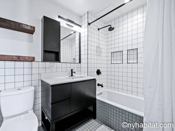 La cocina abierta está equipada con un horno, un lavavajillas, un frigorífico y pequeños electrodomésticos. Está dividida por una barra que da a un salón con un sofá. Hay dos habitaciones que comparten un espacio con suelo de madera y un poco de luz natural procedente de dos ventanas. De hecho, todo el apartamento, excepto los dos cuartos de baño, se beneficia de la sensación elemental del suelo de madera. Cada uno de los seis dormitorios tiene una distribución única, una cama tamaño full y está amueblado con un estilo moderno. Los dos cuartos de baño completos continúan la estética moderna y ambos tienen un combo de ducha y bañera.