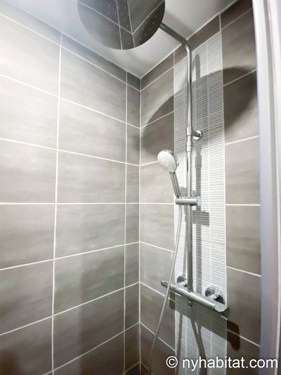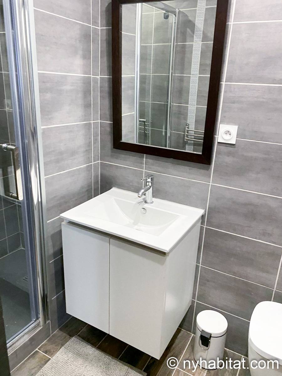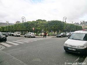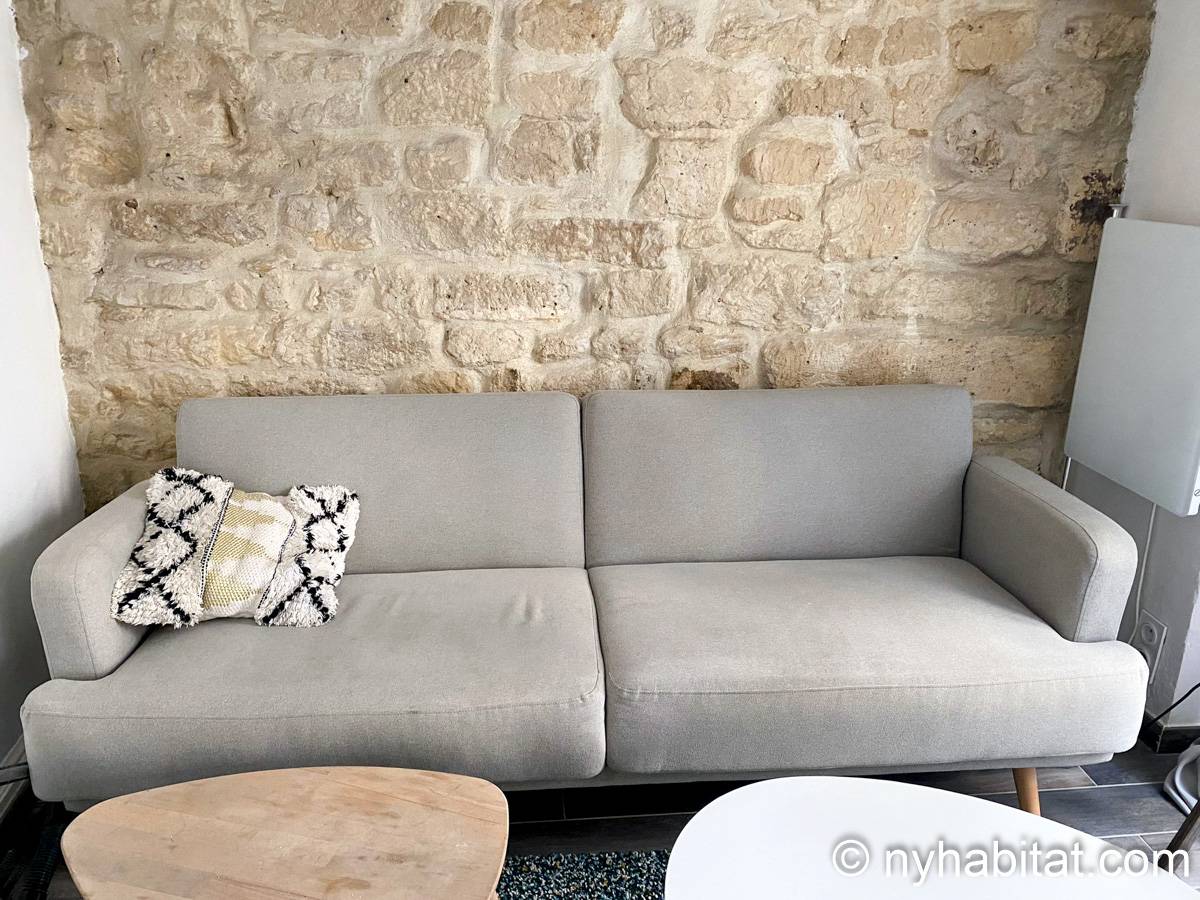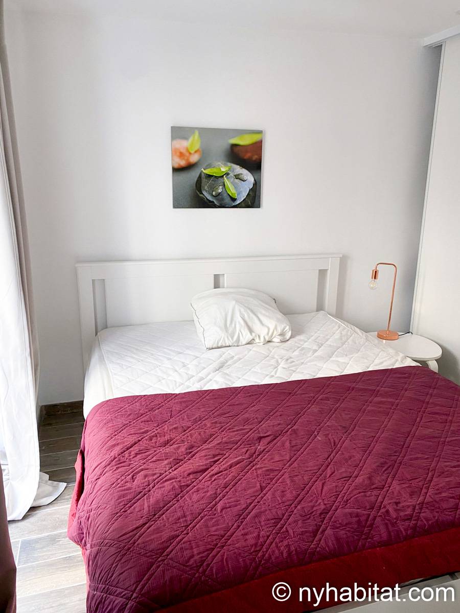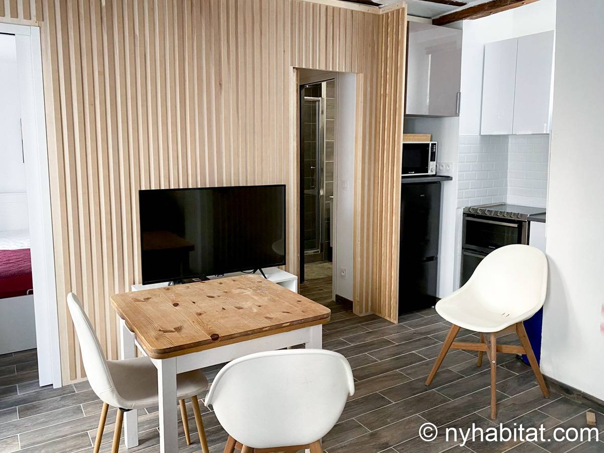 El clásico apartamento parisino presenta suelo de madera oscura, techo con vigas a la vista y accesorios de madera oscura. Hay dos ventanas grandes con cortinas que dan a una estrecha calle residencial. El apartamento incluye un sofá-cama para dos personas, una cama individual plegable y una cama tamaño queen para tener mayor espacio en la zona de descanso. Otros elementos a destacar del apartamento son una cocina pequeña totalmente equipada, televisor con lector de DVD y una moderna ducha con un cabezal de ducha de mano.