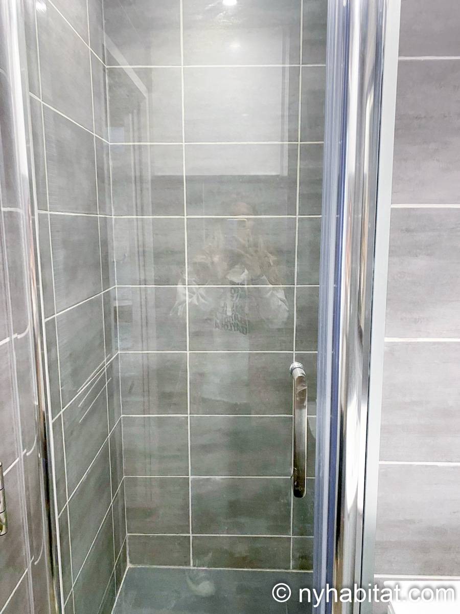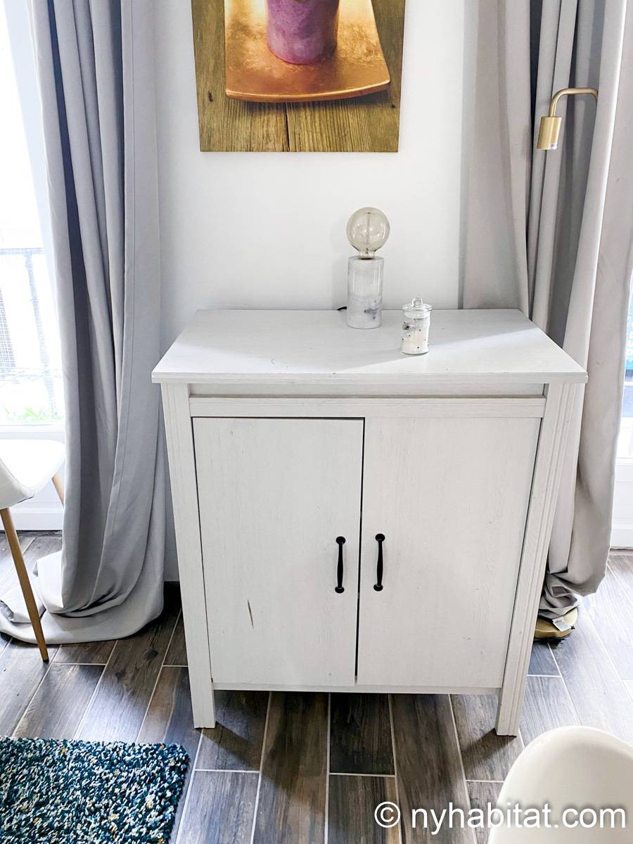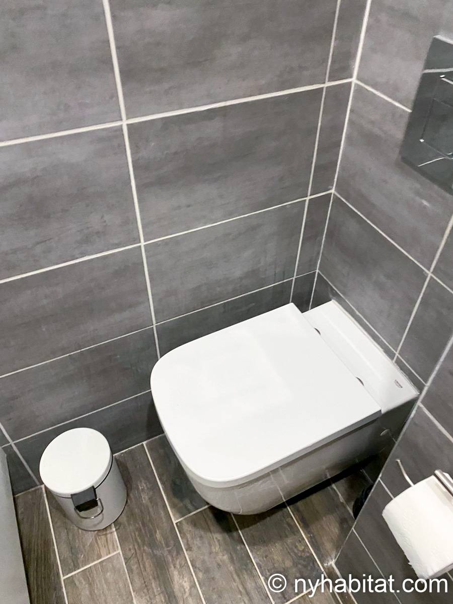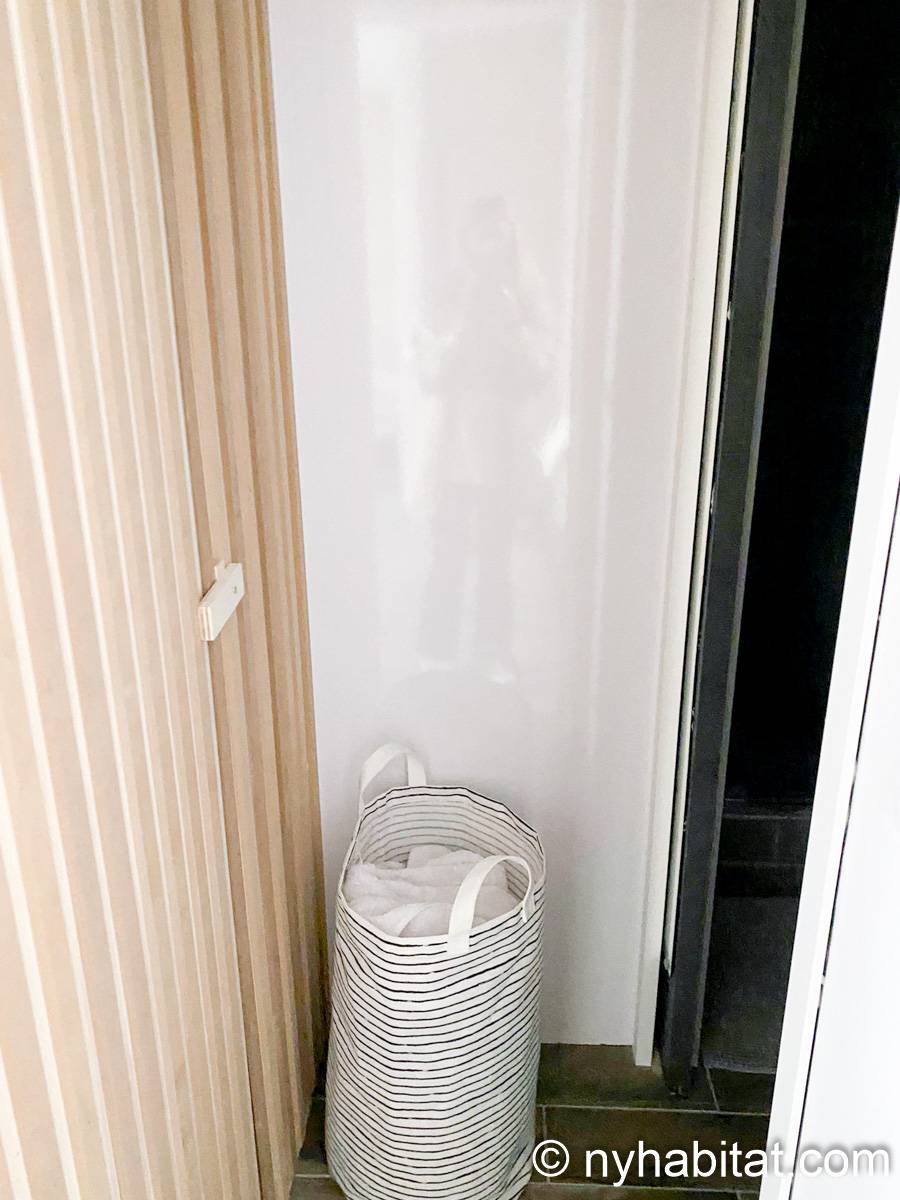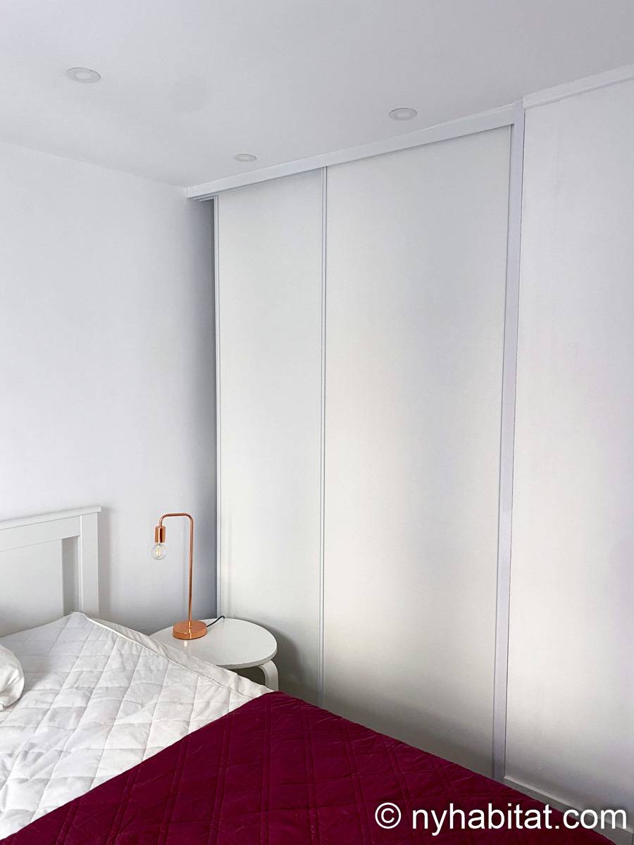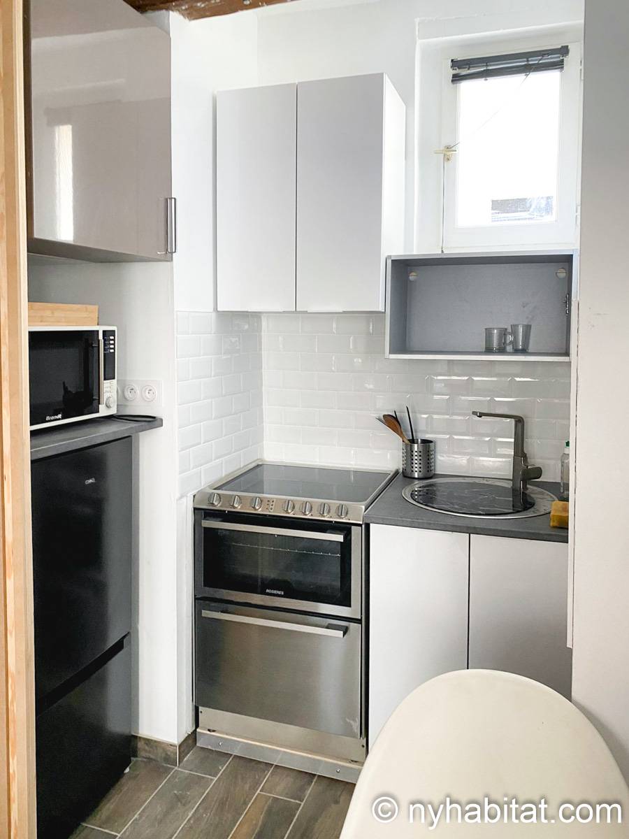 El clásico apartamento parisino presenta suelo de madera oscura, techo con vigas a la vista y accesorios de madera oscura. Hay dos ventanas grandes con cortinas que dan a una estrecha calle residencial. El apartamento incluye un sofá-cama para dos personas, una cama individual plegable y una cama tamaño queen para tener mayor espacio en la zona de descanso. Otros elementos a destacar del apartamento son una cocina pequeña totalmente equipada, televisor con lector de DVD y una moderna ducha con un cabezal de ducha de mano.
