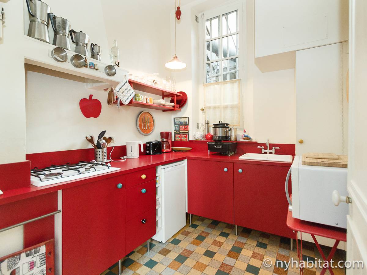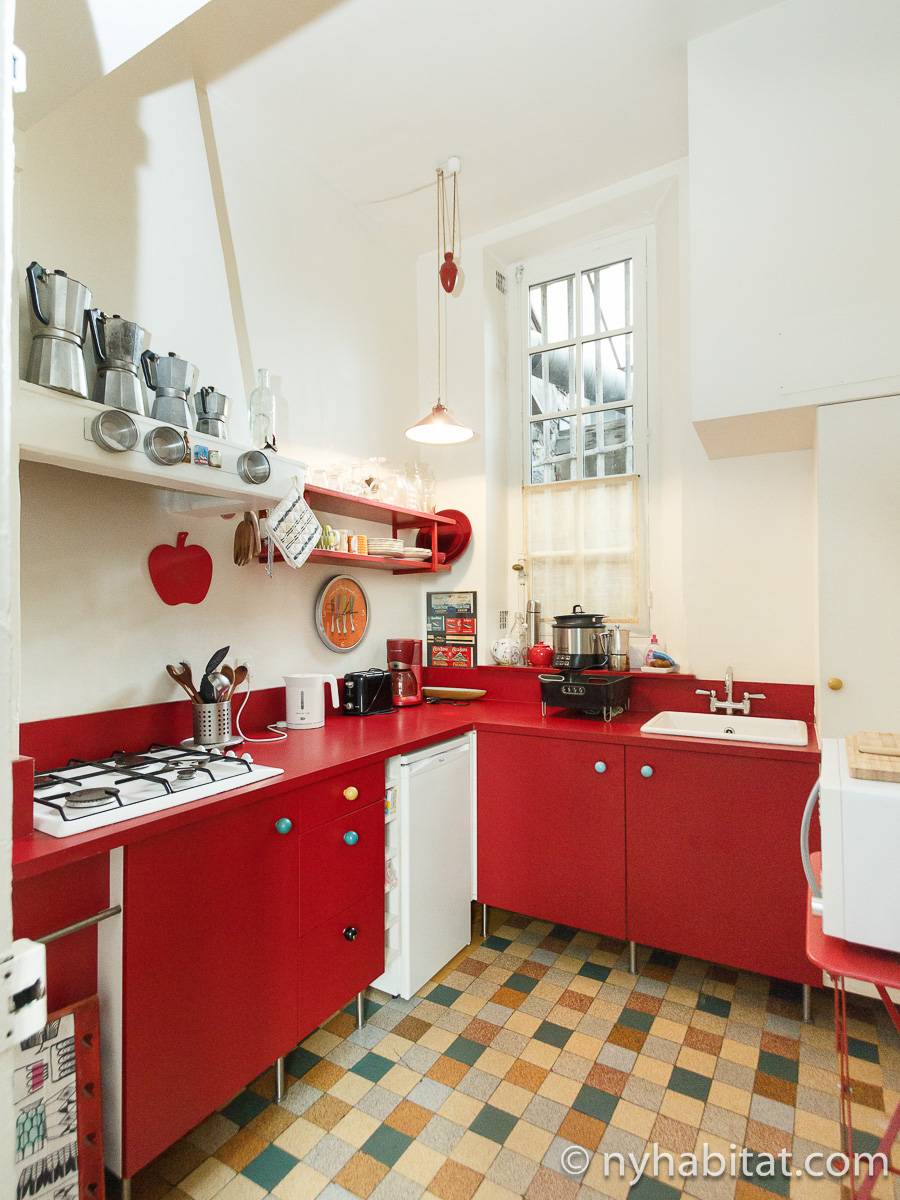 La cocina con muebles rojos resulta un estallido de color y crea un ambiente muy alegre. Cuenta con armarios, electrodomésticos de cocina y una ventana que permite dar ventilación al espacio. El cuarto de baño consta de una ducha, lavadora y toallas limpias.