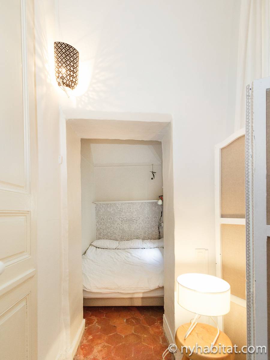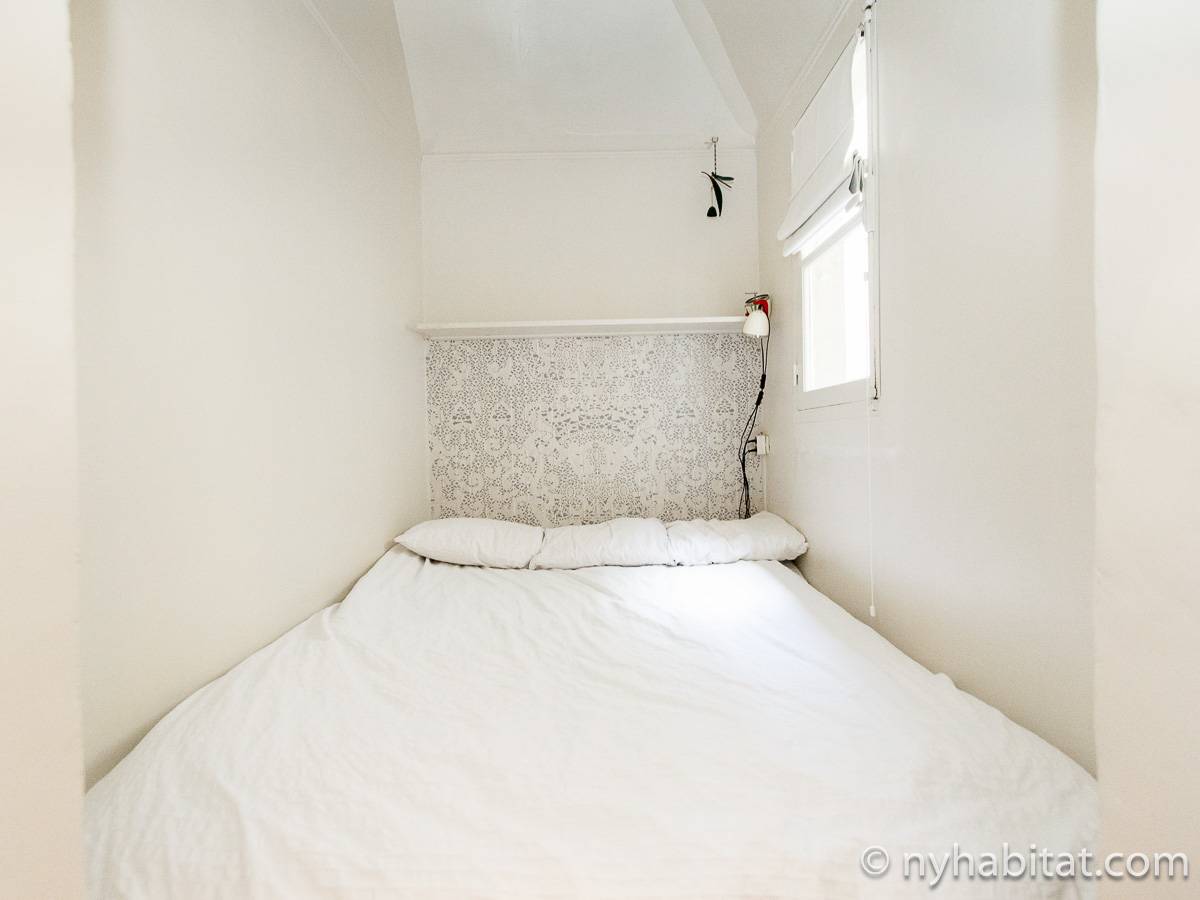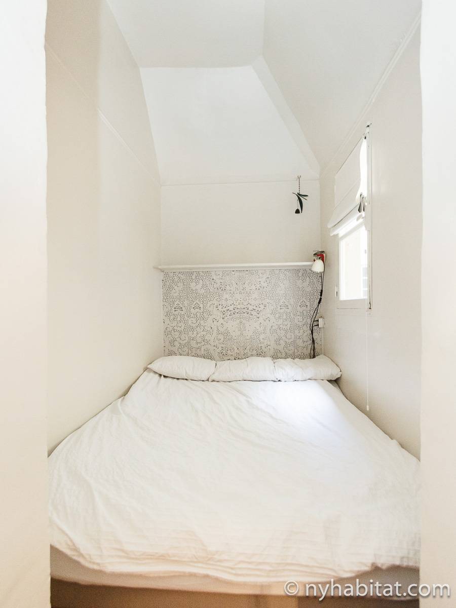 El dormitorio del apartamento abarca 5m2 e incluye una litera con dos colchones. Estos colchones miden aproximadamente 90cm x 190cm. Son un poco más estrechos que los colchones individuales habituales. Aquí también hay una ventana con vistas al patio.