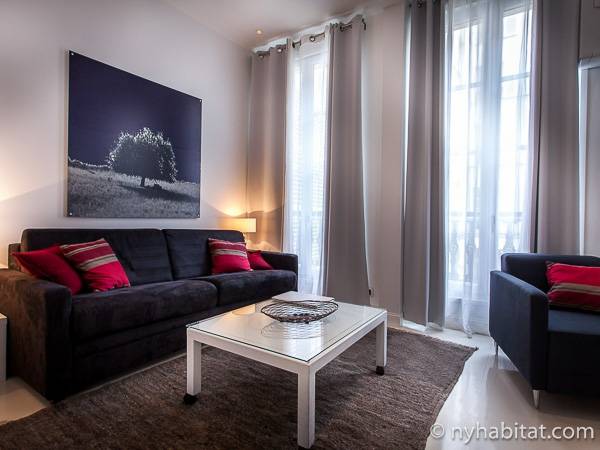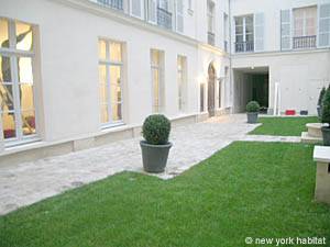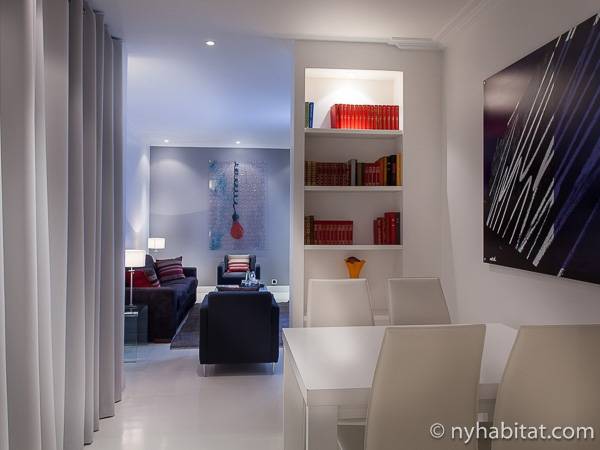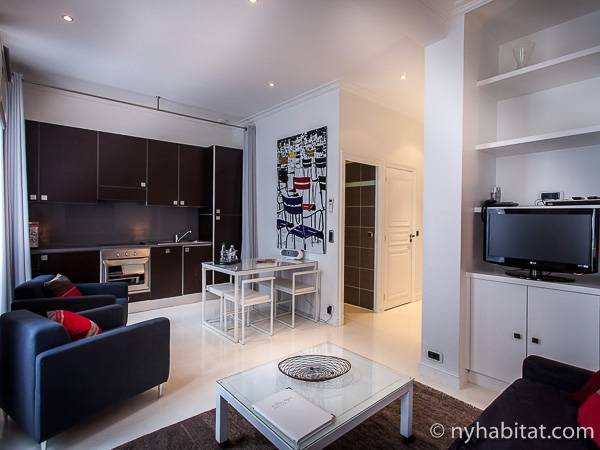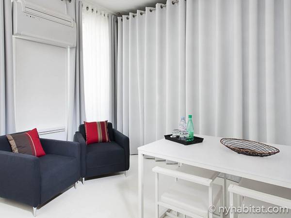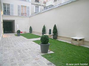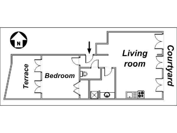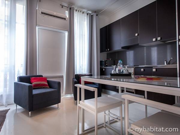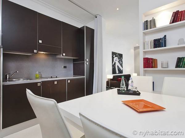 El salón, de 19m², tiene tres ventanas de doble cristal que dan al encantador patio. Como entretenimiento, encontrará una televisión con canales internacionales, un reproductor de DVD y un dock para iPod. La cocina es una zona abierta al salón que da una sensación de mayor espacio. Está equipada con todo lo necesario para cocinar sus comidas en casa tales como fuegos vitrocerámica, horno, cafetera y tostador e incluso para una mayor comodidad cuenta con lavavajillas y lavadora. El dormitorio cuenta con una cama de matrimonio que se ha decorado para crear una zona cómoda y de descanso. Las dos puertas con ventana le dan acceso a una terraza privada donde encontrará una mesa extensible con dos sillas, perfecta para disfrutar de un refresco o comida romántica en un día soleado.
