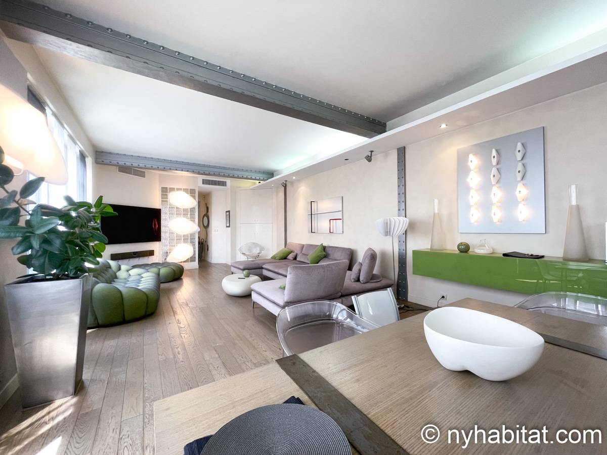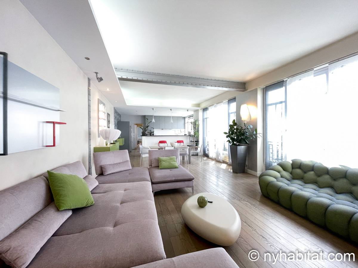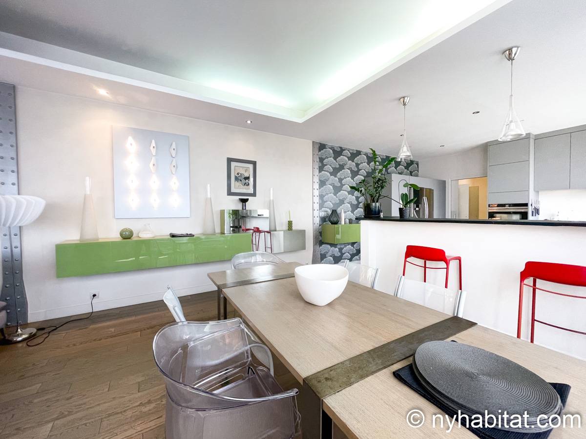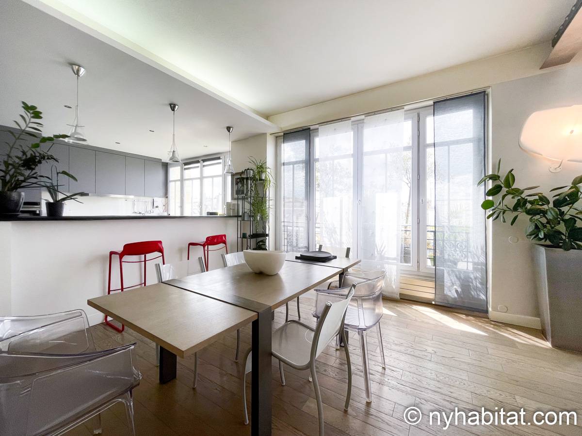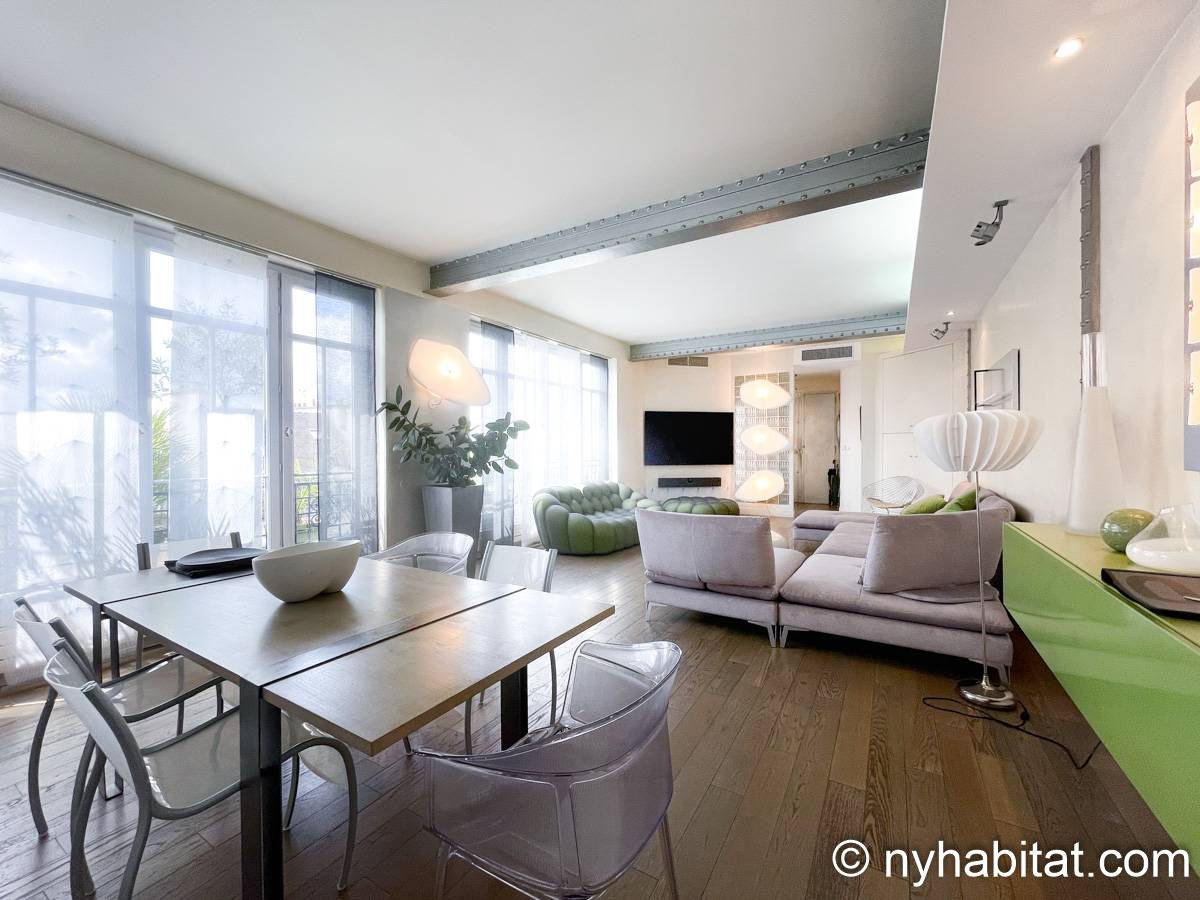 La puerta principal da directamente a la zona de estar. Sus grandes ventanas iluminan el espacio con luz natural. En este salón hay dos sofás, una mesa de centro y televisión con canales internacionales. Además de una mesa de comedor para 6 donde podrá disfrutar de platos franceses.