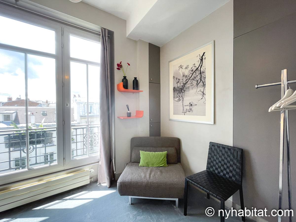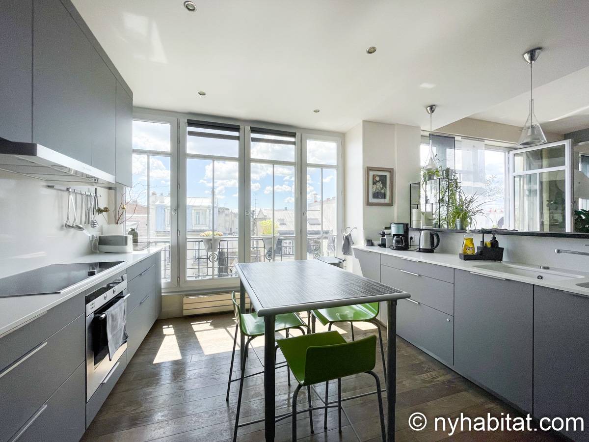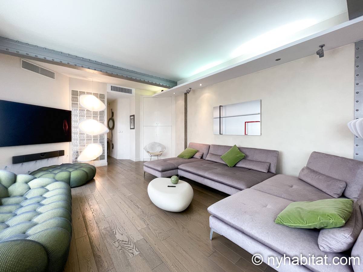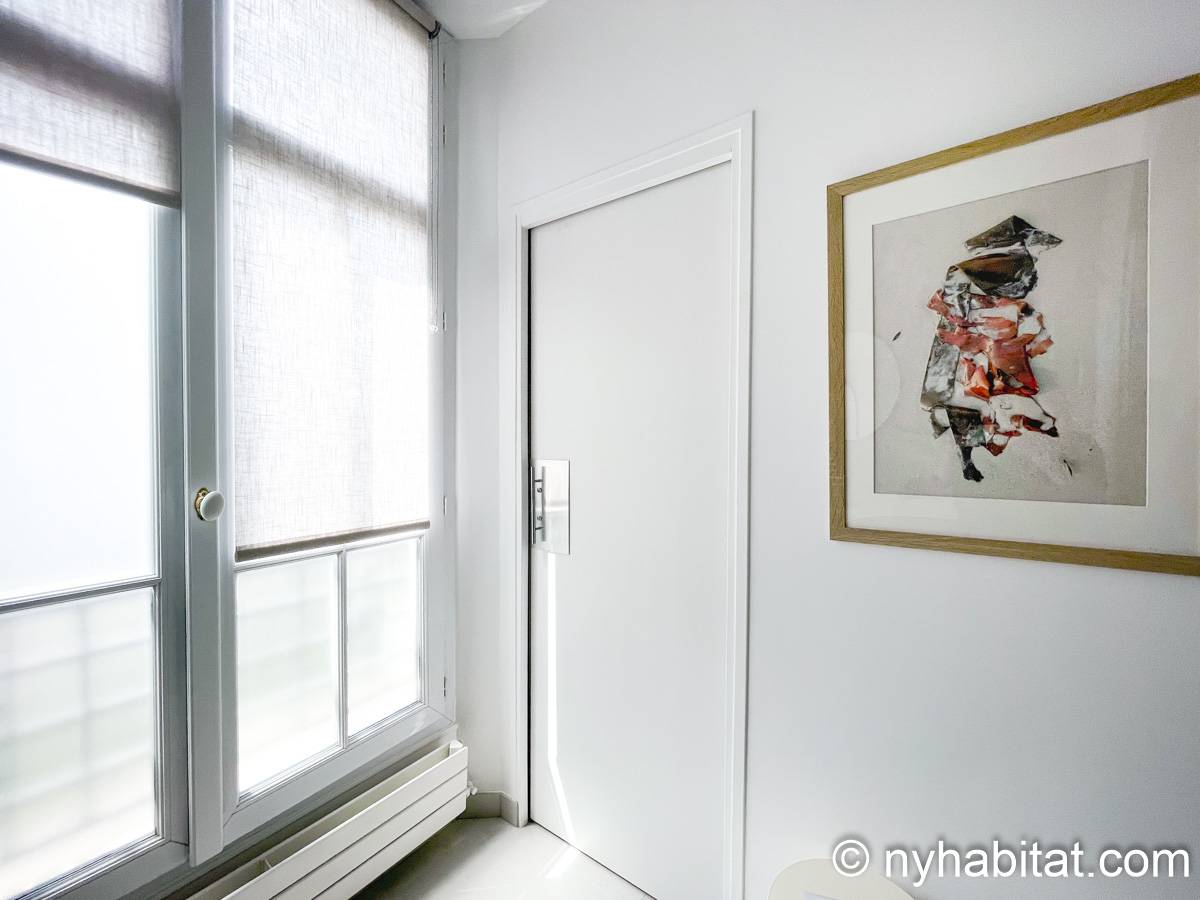 La puerta principal da directamente a la zona de estar. Sus grandes ventanas iluminan el espacio con luz natural. En este salón hay dos sofás, una mesa de centro y televisión con canales internacionales. Además de una mesa de comedor para 6 donde podrá disfrutar de platos franceses.