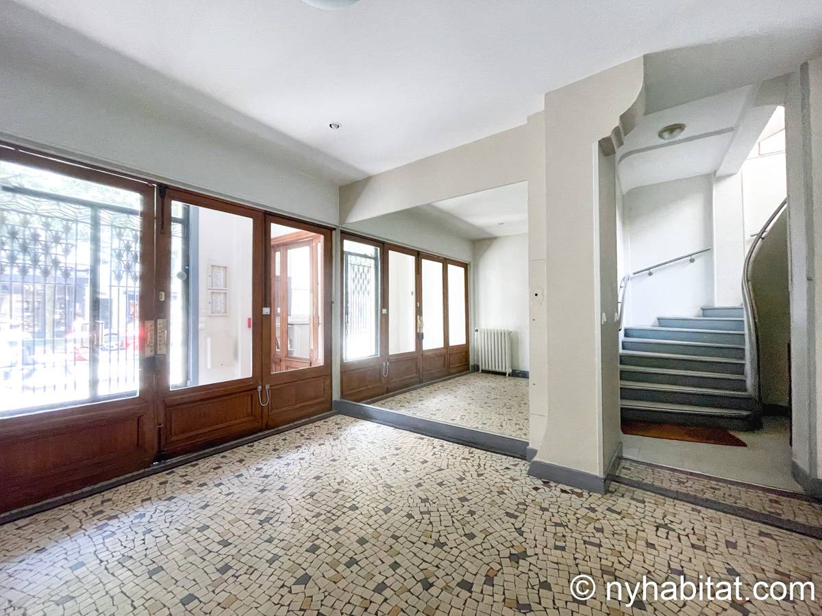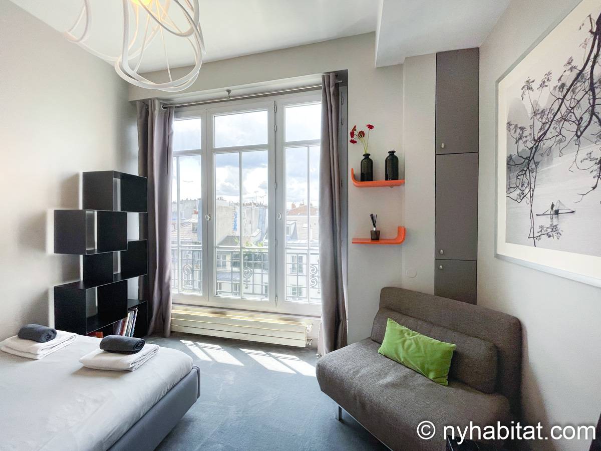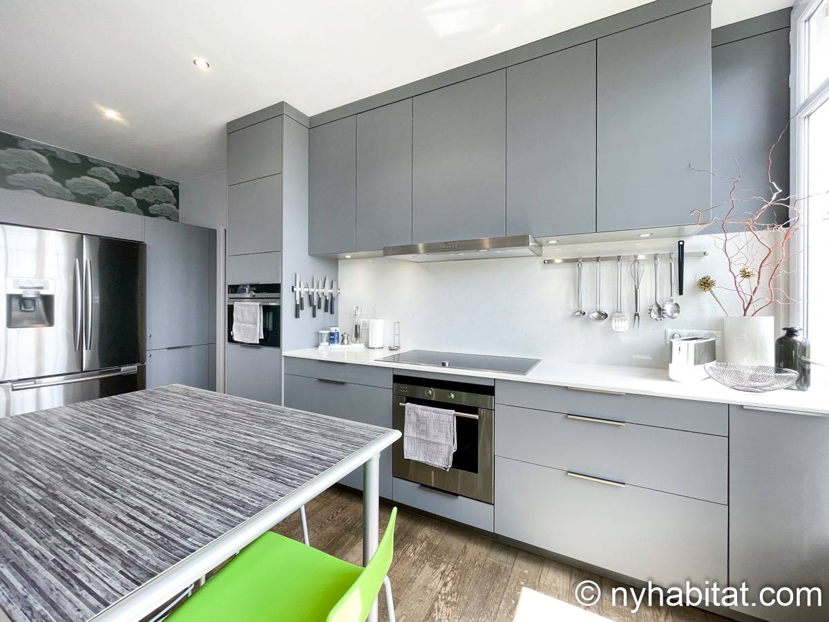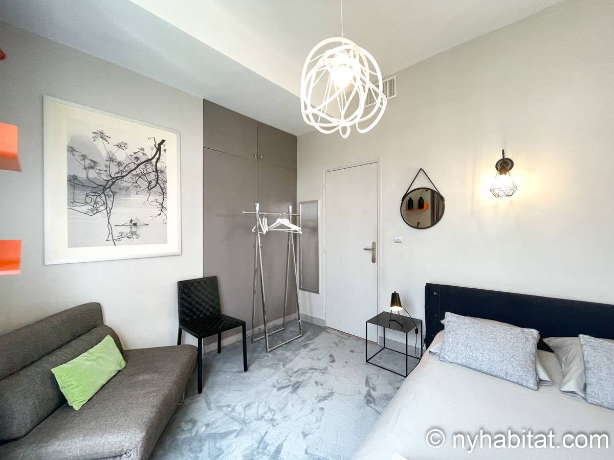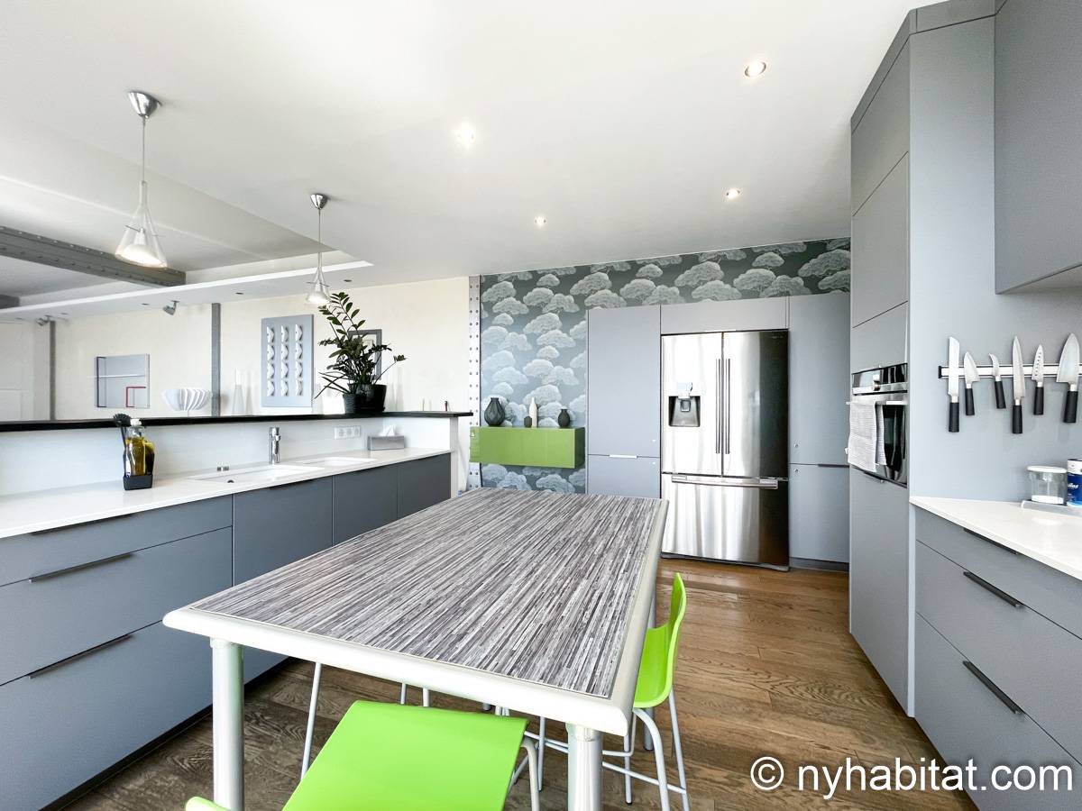 La puerta principal da directamente a la zona de estar. Sus grandes ventanas iluminan el espacio con luz natural. En este salón hay dos sofás, una mesa de centro y televisión con canales internacionales. Además de una mesa de comedor para 6 donde podrá disfrutar de platos franceses.