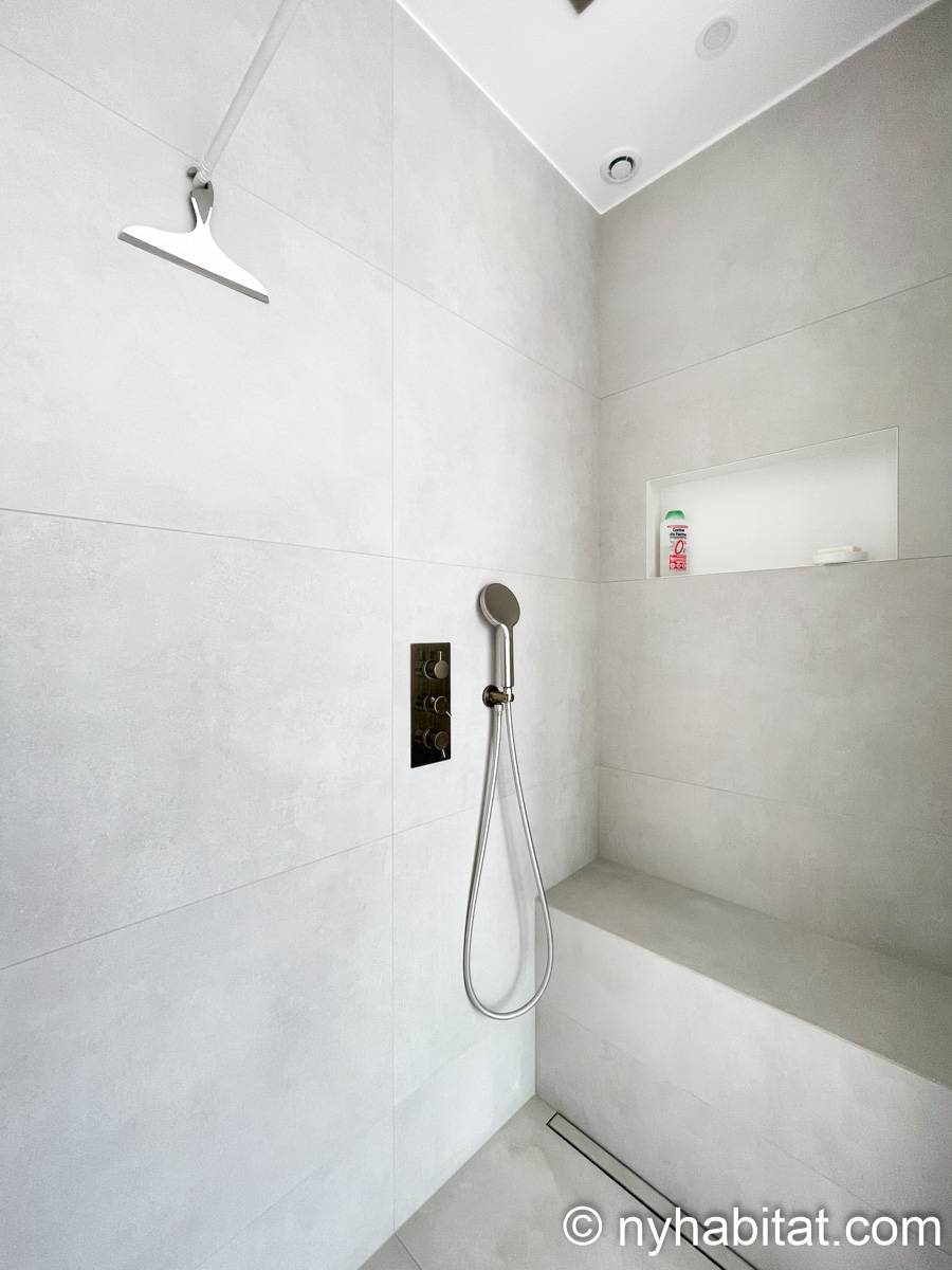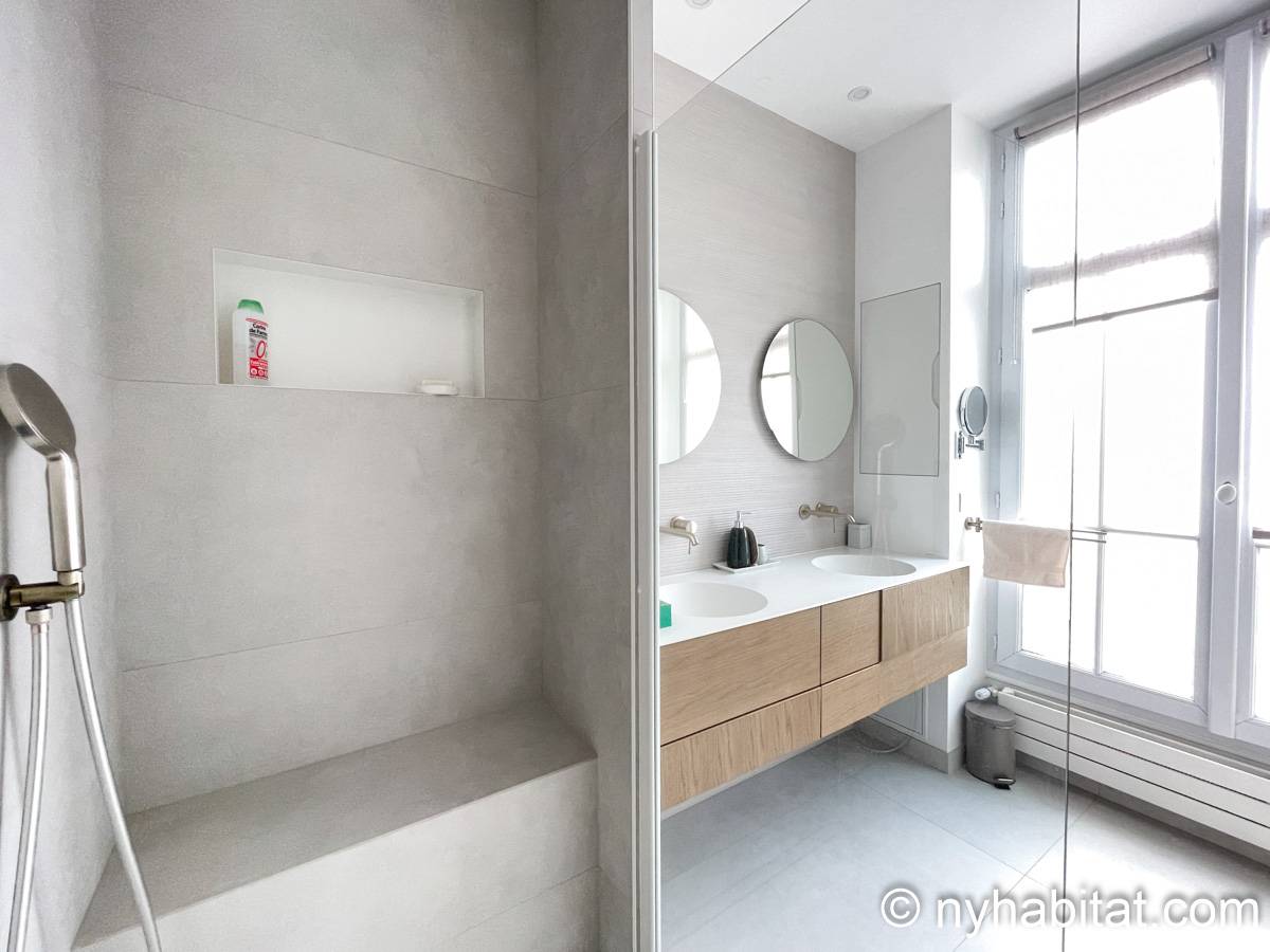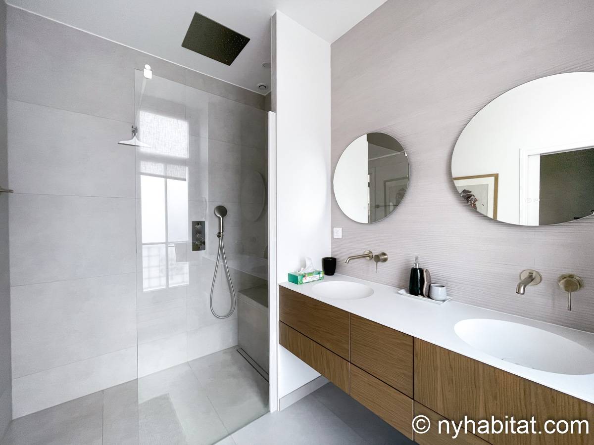El baño 2 presenta una ducha, inodoro y lavabo doble. También hay un aseo.