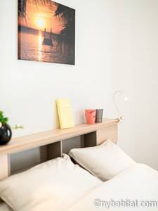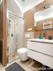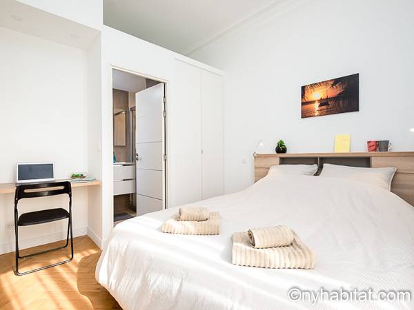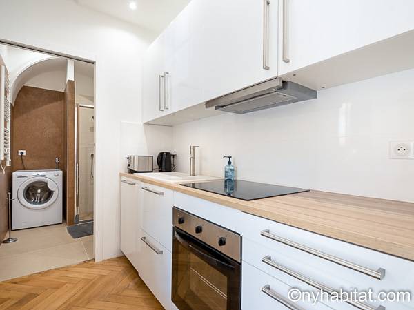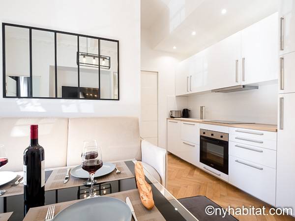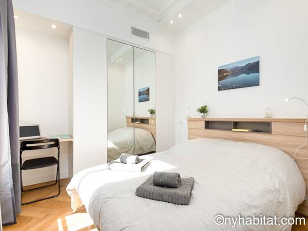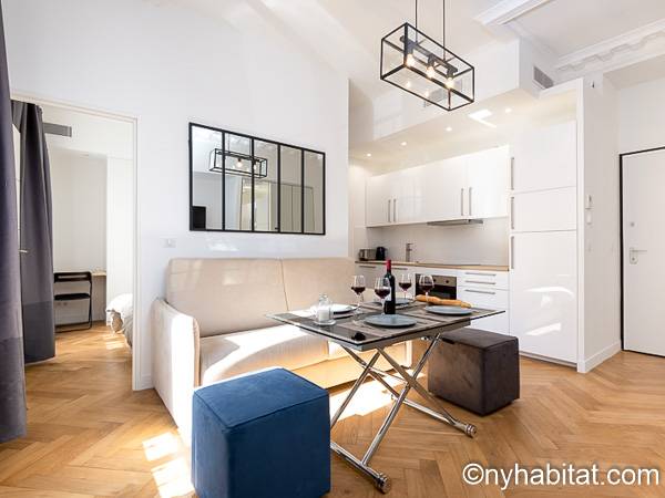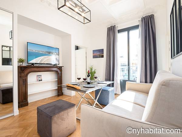 Conocida en parte por los edificios de la Belle Époque, a Niza no le falta una bella arquitectura. Con este apartamento, la artesanía en el interior coincide con la artesanía en el exterior. El salón está concebido artísticamente desde el suelo hasta el techo, con maderas de estilo chevron y artesonados. Sin embargo, la estética no es la única consideración del espacio. La practicidad también es clave. Un sofá se despliega en una sofá cama doble. Hay un televisor y aire acondicionado. El aire acondicionado se extiende a los 2 dormitorios. Uno tiene una cama tamaño queen. El otro tiene una cama doble. La cocina abierta está situada en un espacio propio entre el salón y uno de los cuartos de baño. Desde esta ubicación central se puede servir todo lo que se puede cocinar con un horno, un microondas, una cafetera y una tostadora con ingredientes que se pueden almacenar en la nevera o el congelador. La cocina tiene un lavavajillas para que no tenga que quedarse mucho tiempo después de cocinar. Los 2 cuartos de baño tienen ducha. El que está cerca de la cocina tiene techo abovedado.
