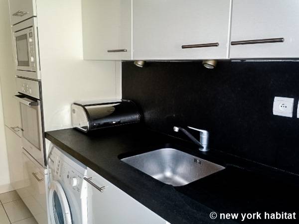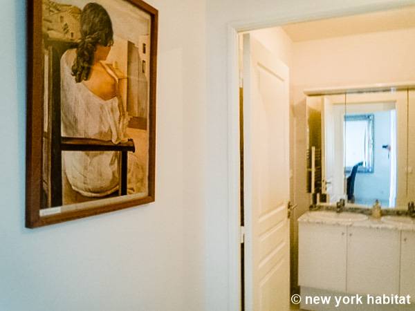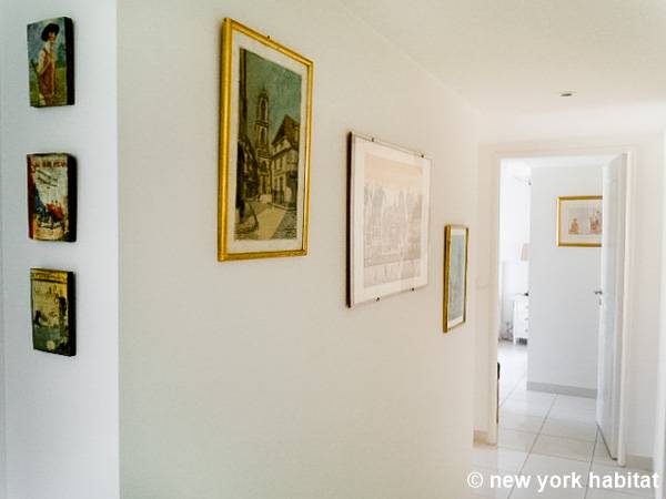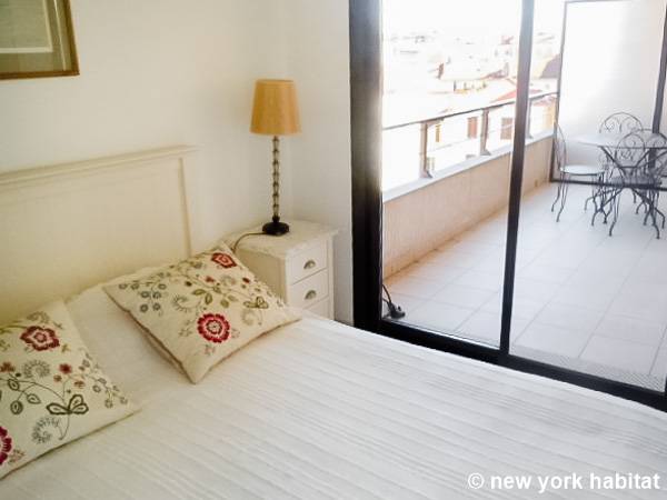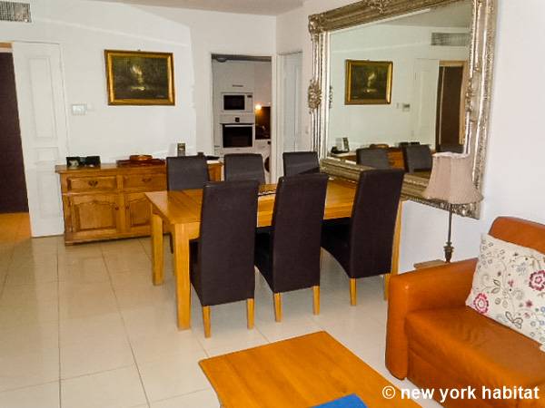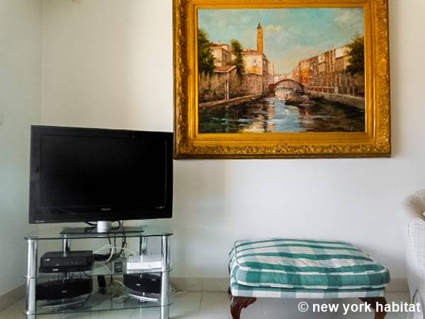 El salón, que destaca por su ecléctica decoración y su luminosidad natural, está amueblado con un sofá y una mesa de comedor para seis comensales. También dispone de televisión por cable. La cocina está equipada con un horno, un frigorífico, un microondas, una tostadora, una cafetera y un lavavajillas.